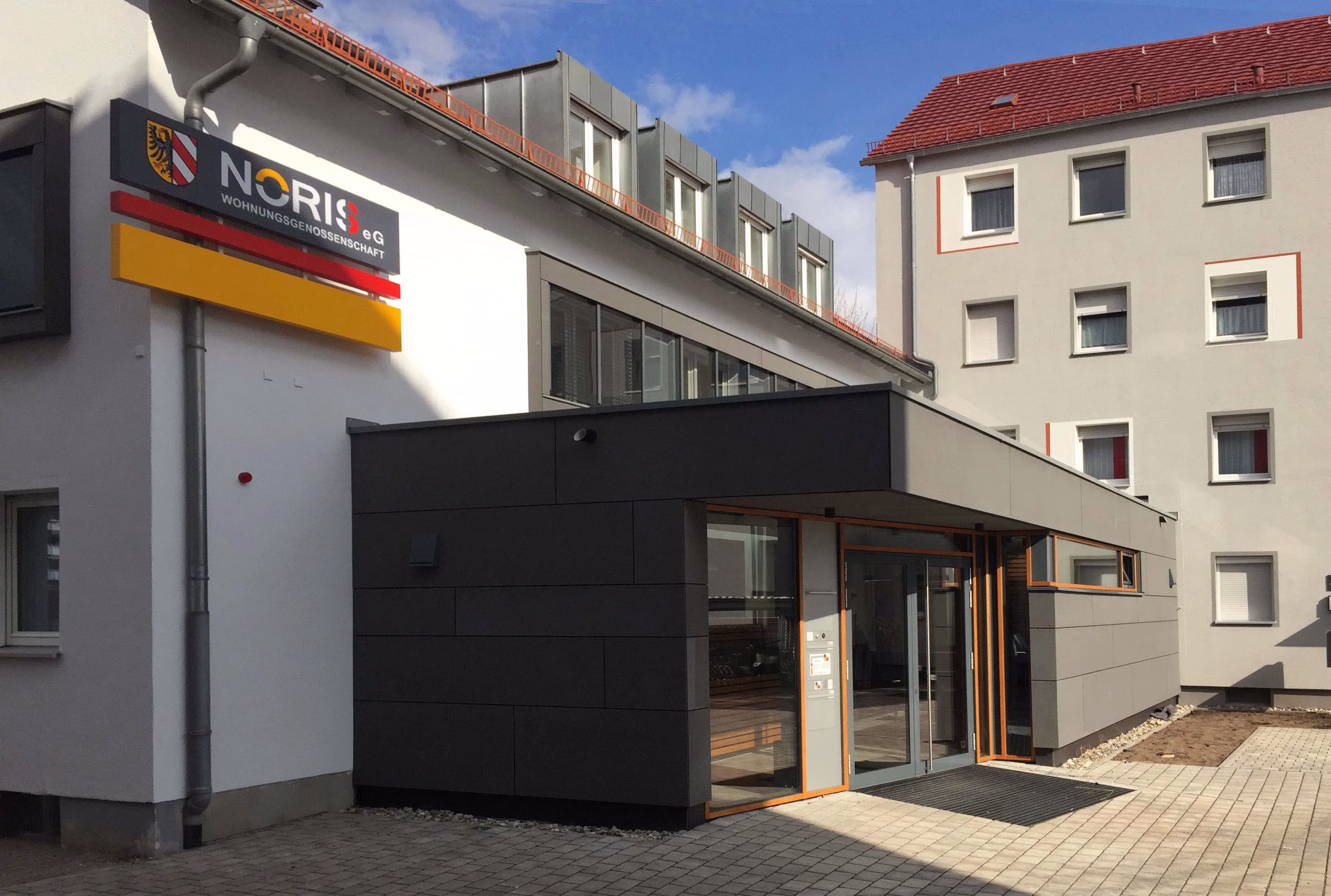 Anbauten an die Geschäftsstelle einer Wohnungsgenossenschaft, Eingangshalle/Büro. Nürnberg-St-Peter. Holzständerbauweise. Innenarchitektur: Barabra Schieder. Fertigstellung 2017.