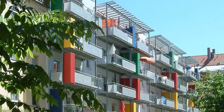 Energetische Sanierung von Mehrfamilienwohnhäusern auf Neubauniveau mit weiteren Sanierungen und Wohnwertverbesserungen: Balkonanbauten, Keller- und Speichersanierung, Treppenhausaufwertung, Kanalsanierung und Freiflächengestaltung in der Hillerstrasse, Muggenhofer Strasse, Pestalozzistrasse und Peyerstrasse, Nürnberg, Südersbühl, insgesamt 163 WE. Realisiert in 4 Bauabschnitten. 2007 – 2010.